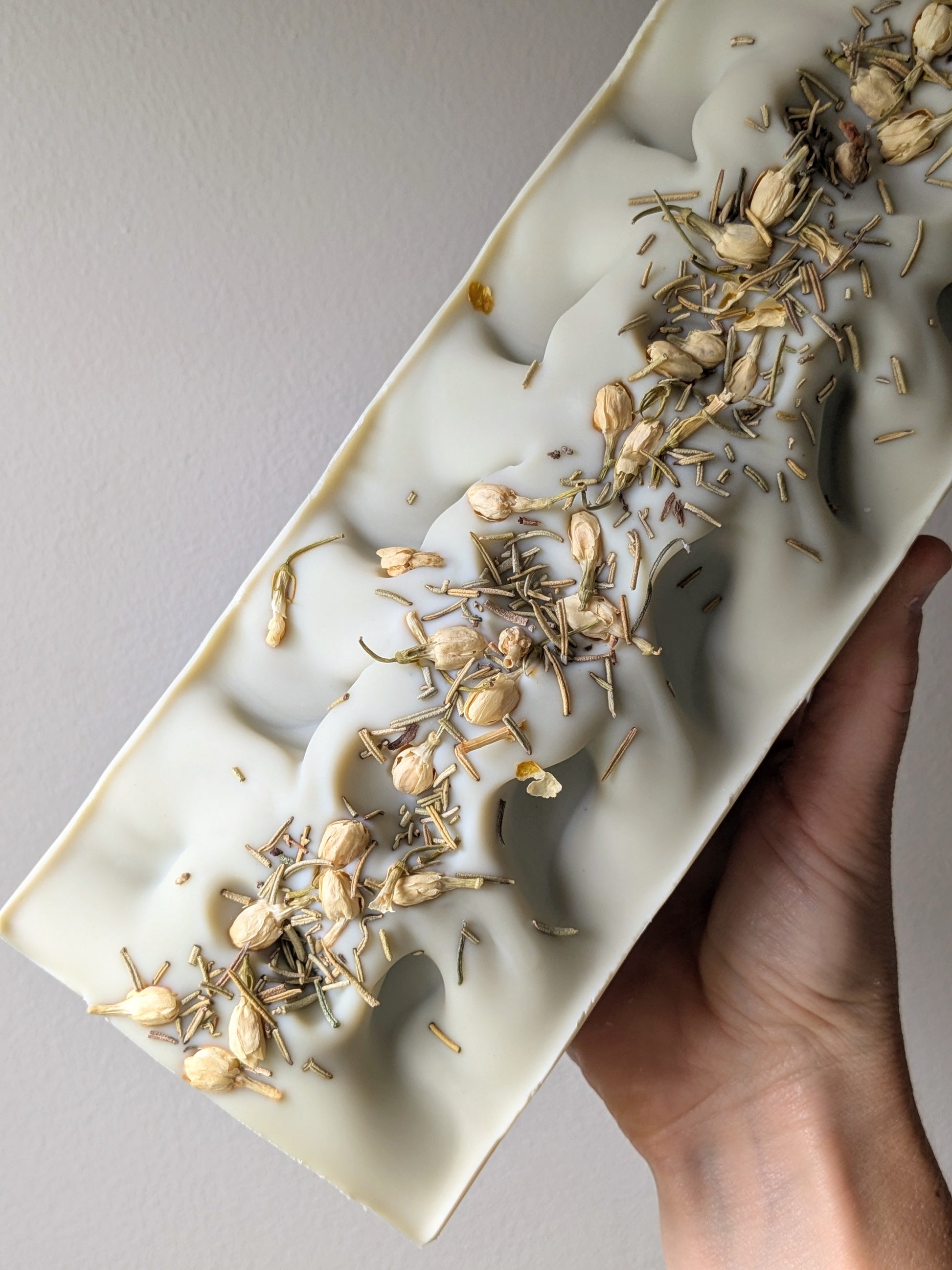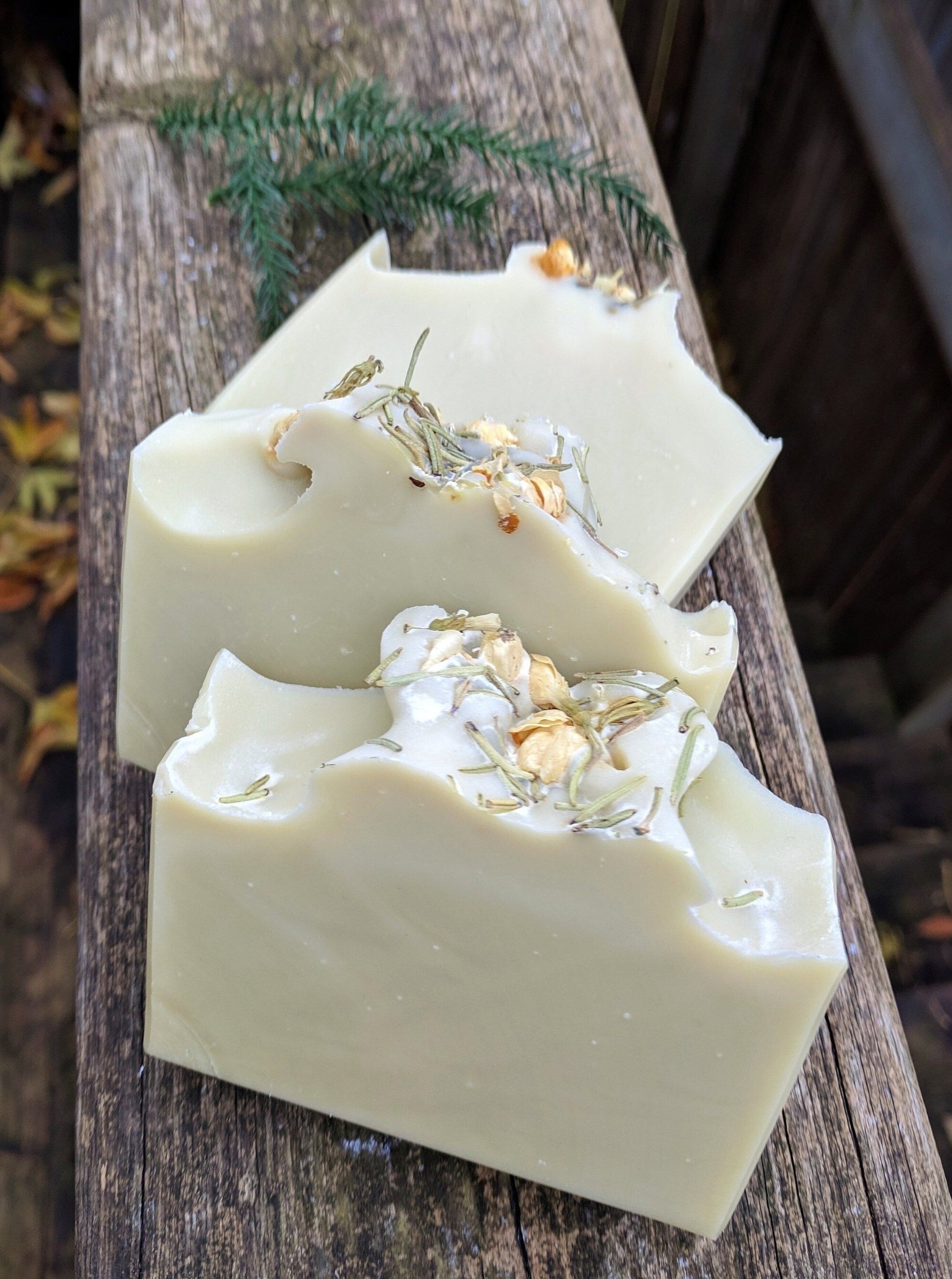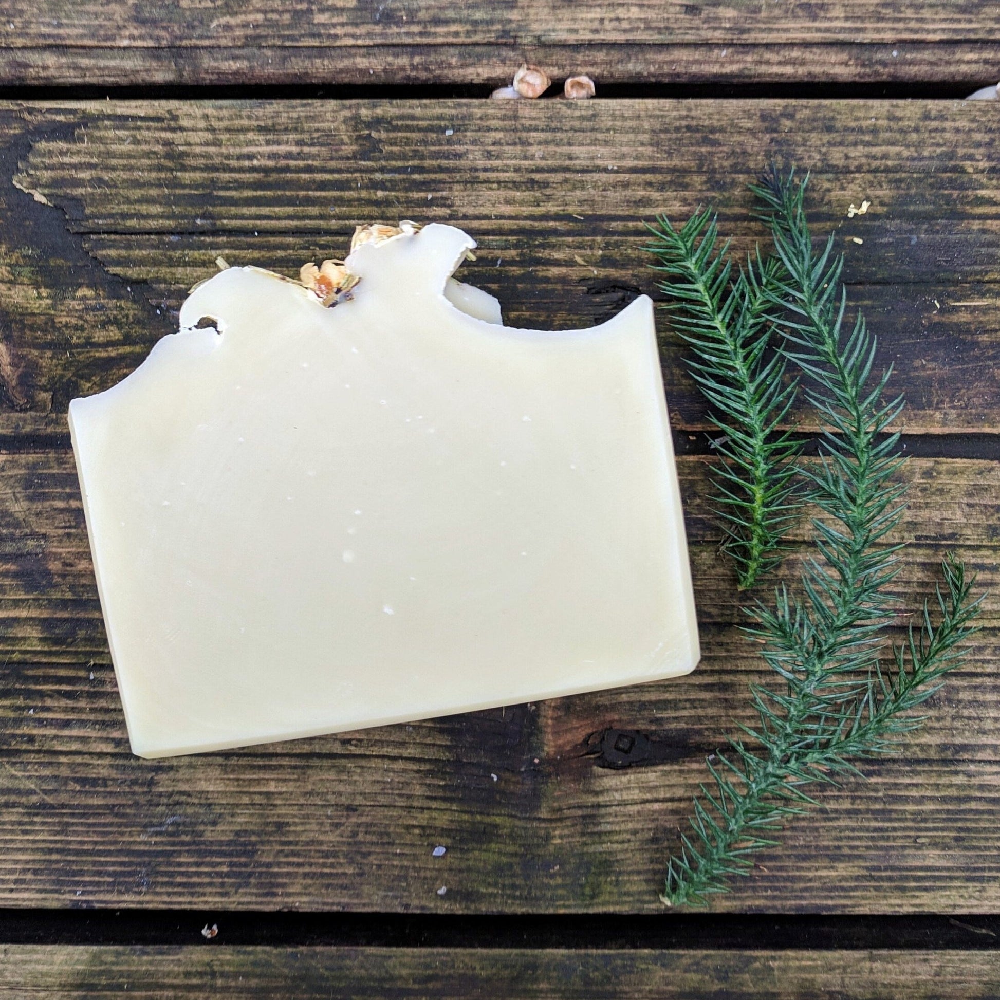 Ce pain de savon s'appelle Evergreen pour son parfum boisé et son toucher hivernal ! Parfumé aux huiles essentielles de romarin et de bois de cèdre et coloré à l'argile verte française, ce savon me rappelle une forêt sempervirente après une chute de neige fraîche :)