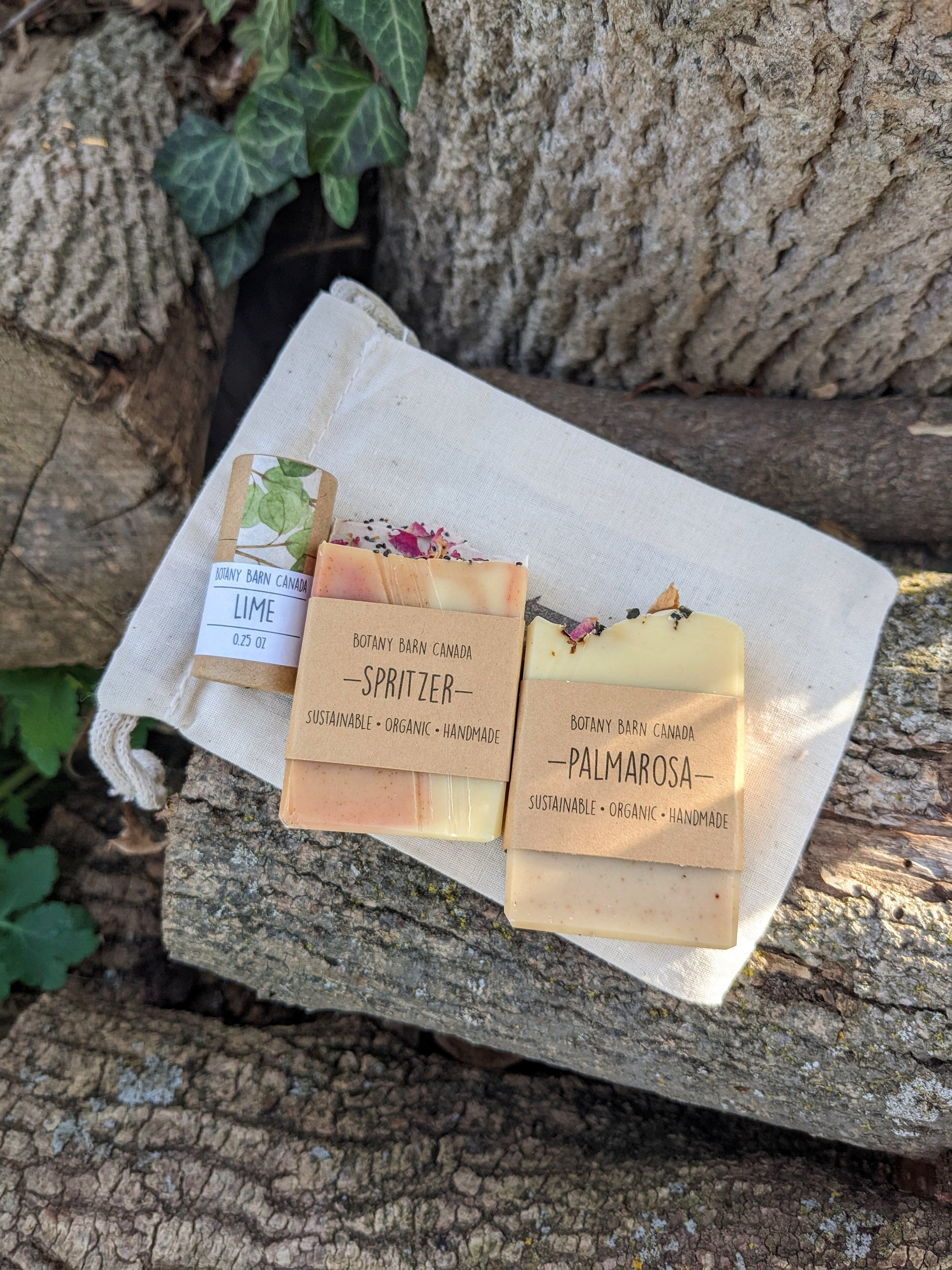 Natural Gift Set | Two Mini Soaps & One Lip Balm in Cotton Bag