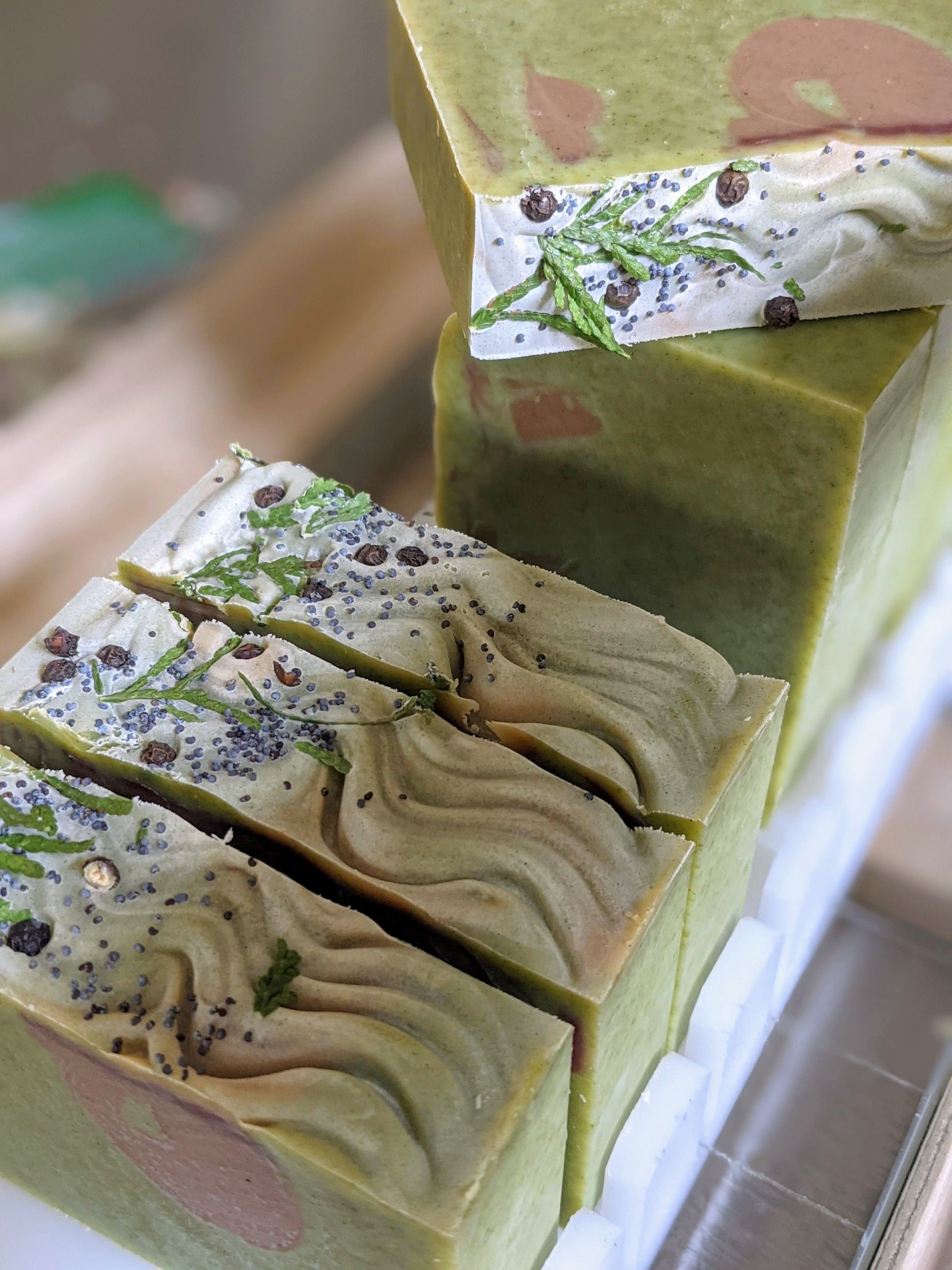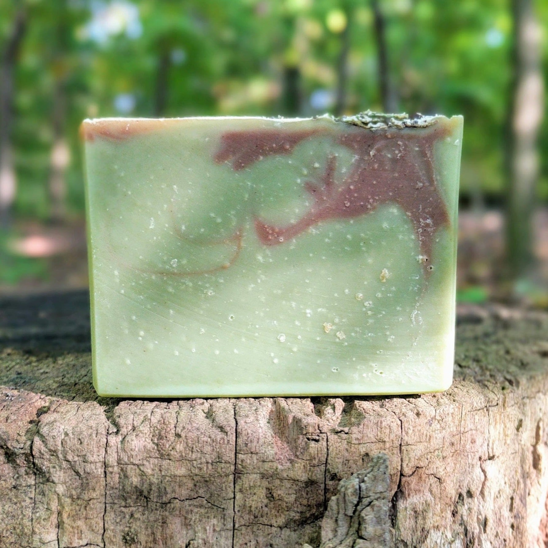 Ingredients: Saponified olive oil*, coconut oil*, shea butter*, avocado oil* castor oil*, black spruce*, peppermint* & pine essential oil, spirulina powder*, spinach powder, cocoa powder*, cedar sprigs, peppercorns, poppy seeds