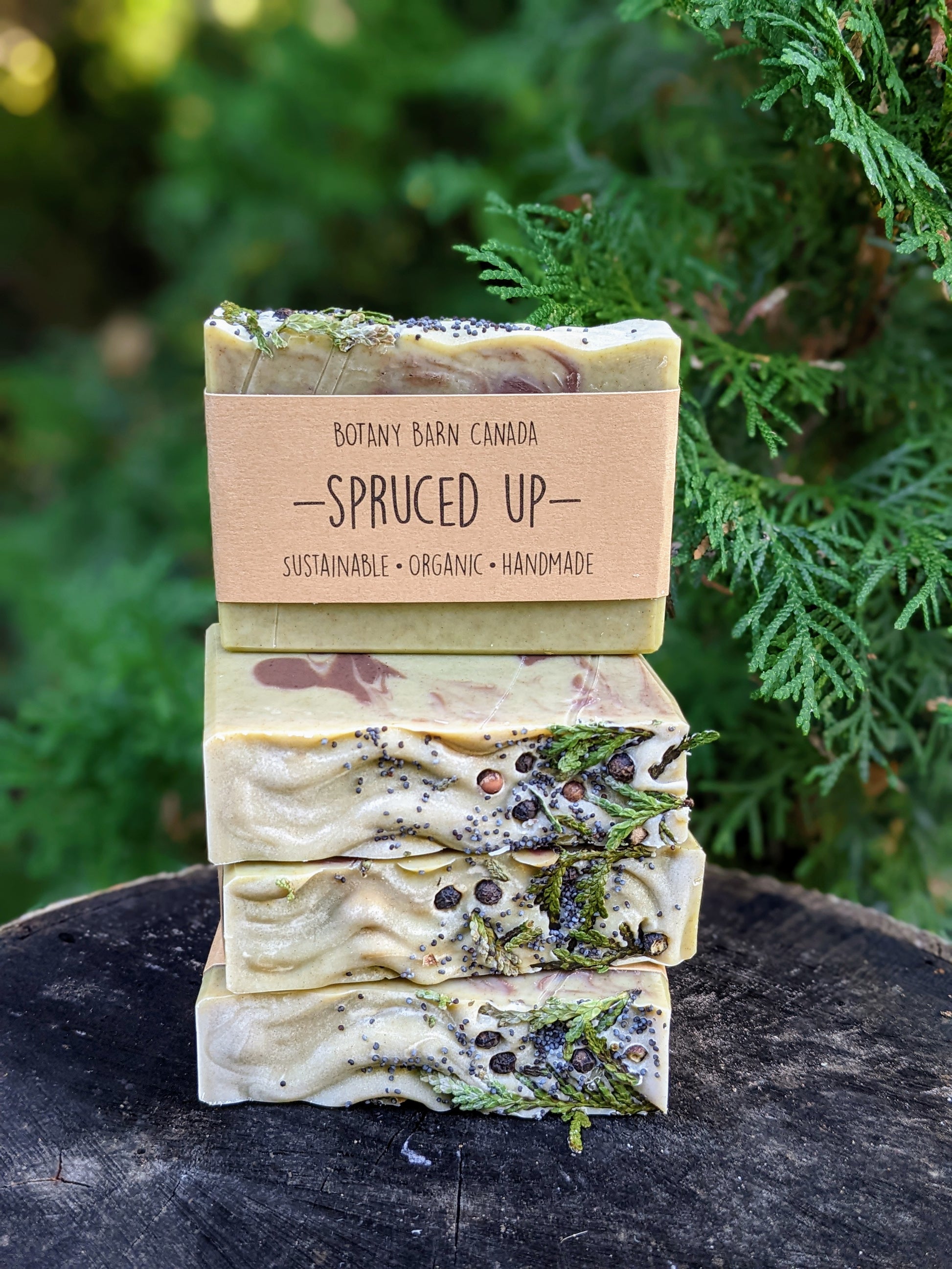 Spruced Up is Botany Barn Canada's most outdoorsy bar of soap! With a bold essential oil blend of Black Spruce, Peppermint, & Pine essential oils, you'll feel like you're taking a shower out in the woods.