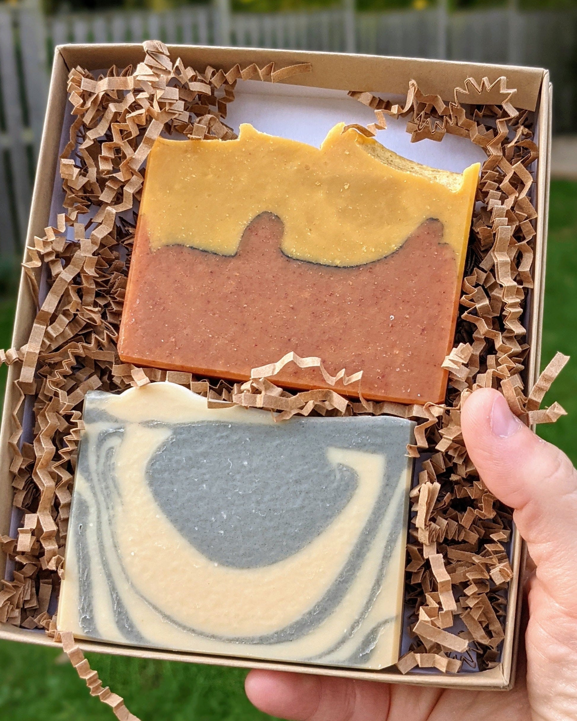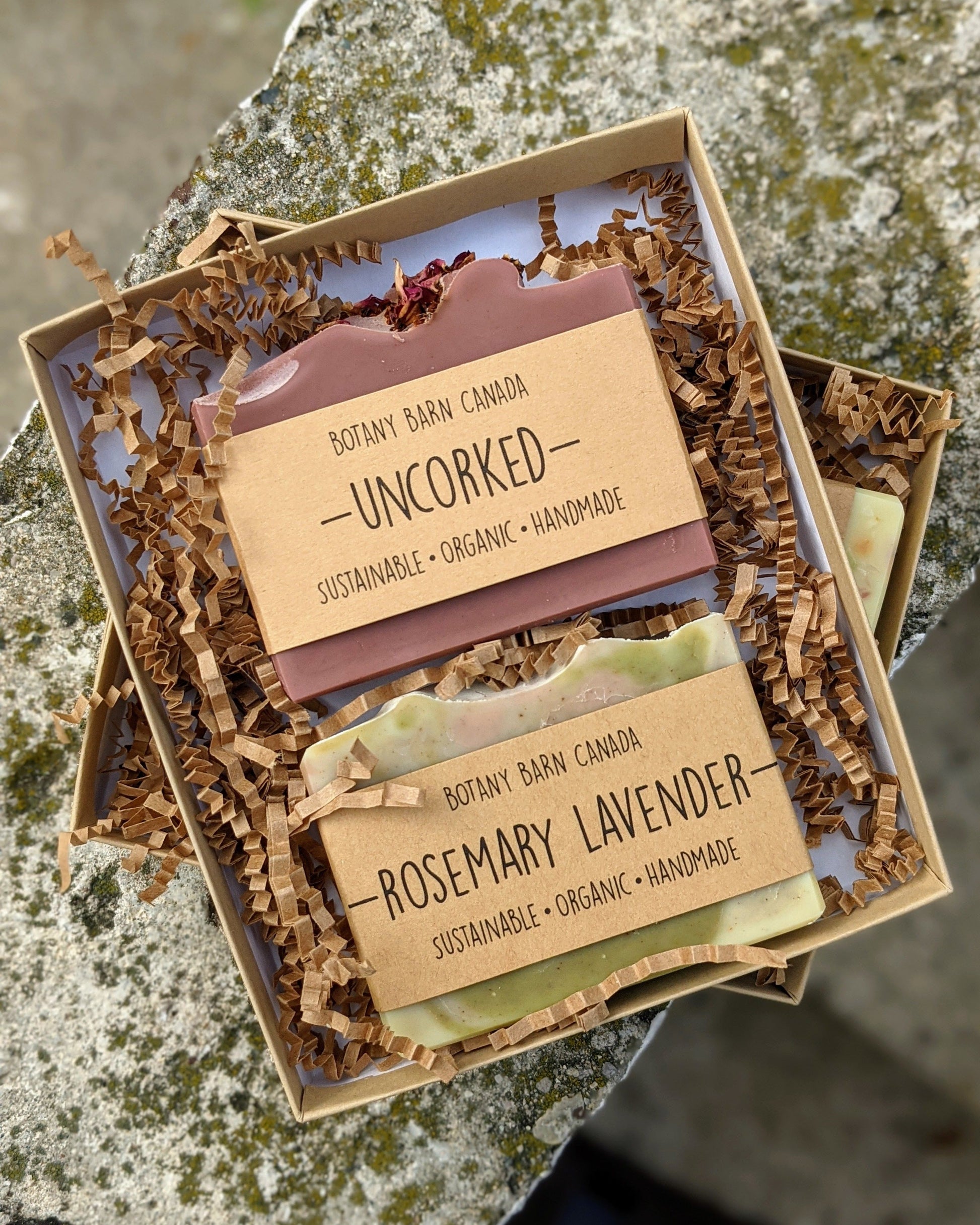 Pick two of your favourite Botany Barn Canada soaps and build a custom gift box for yourself or someone special! Simpy choose your two soaps from the dropdown menus. Your soaps will come packaged in a recycled kraft gift box measuring 6 x 5 x 1 inches.