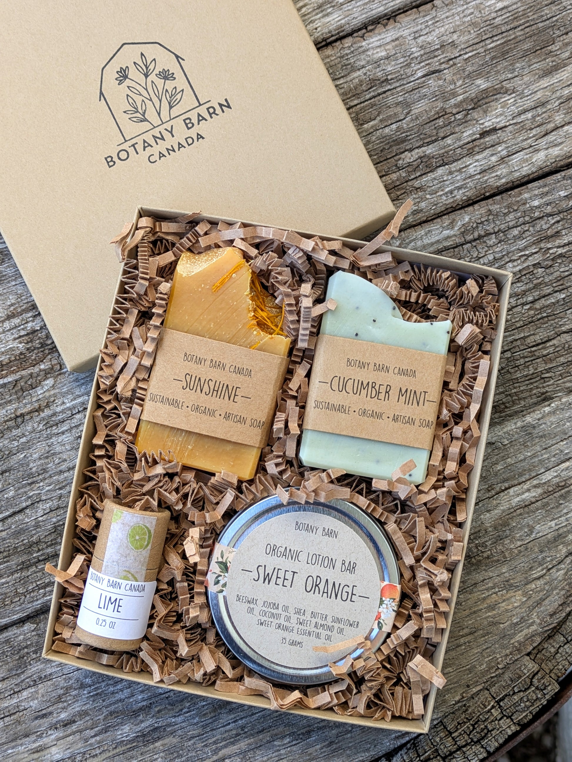 Canadian Made Gift | Mini Box with 2 Soaps, Eco Friendly Lip Balm and Organic Lotion Bar