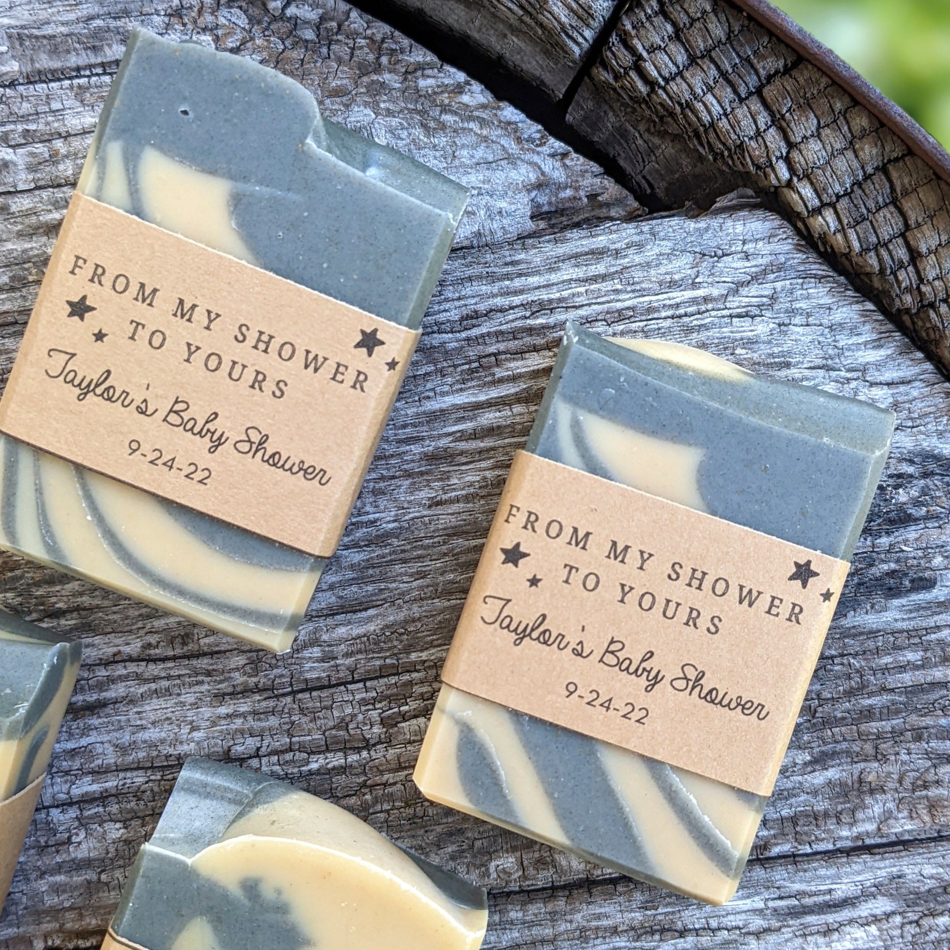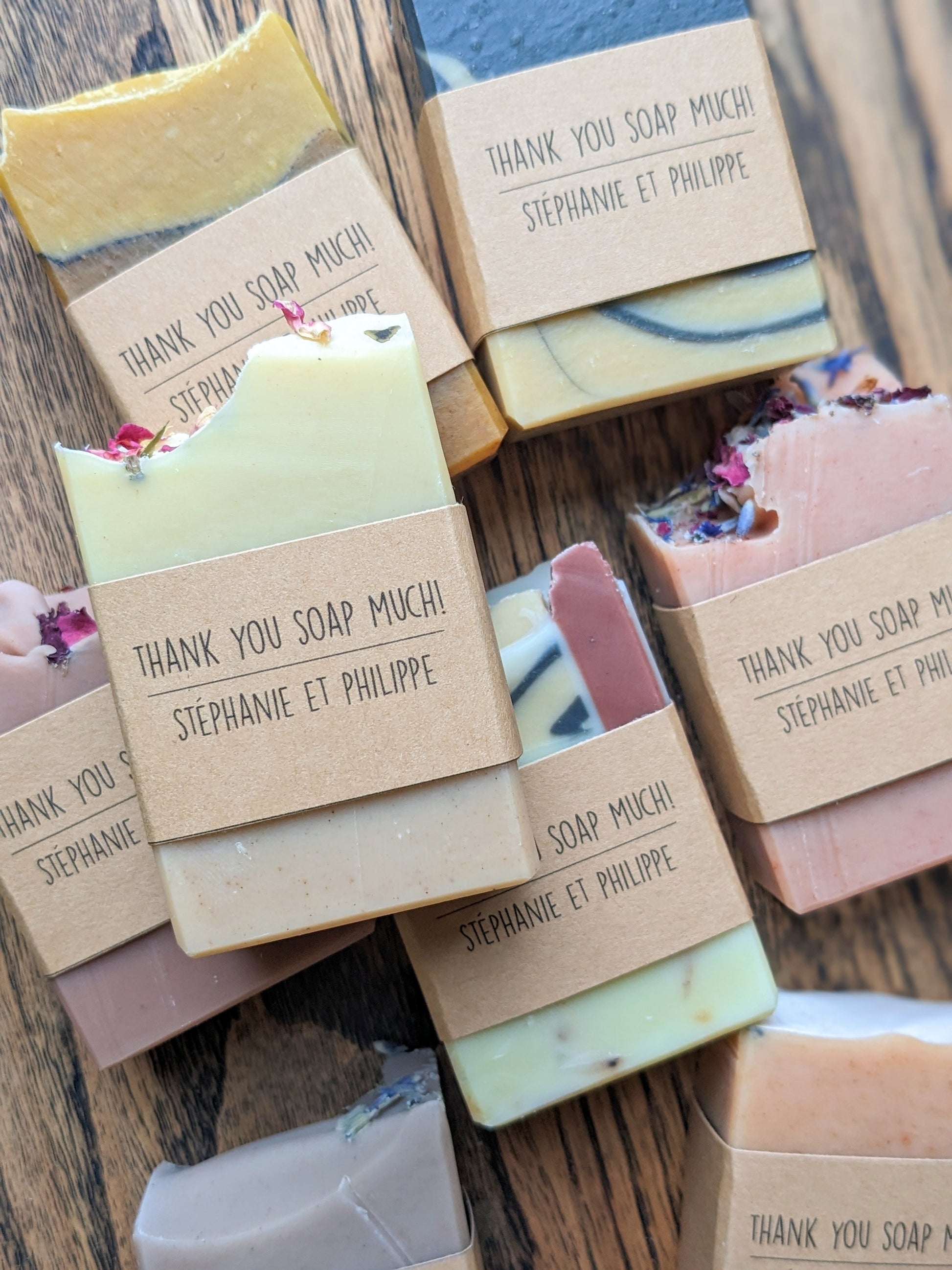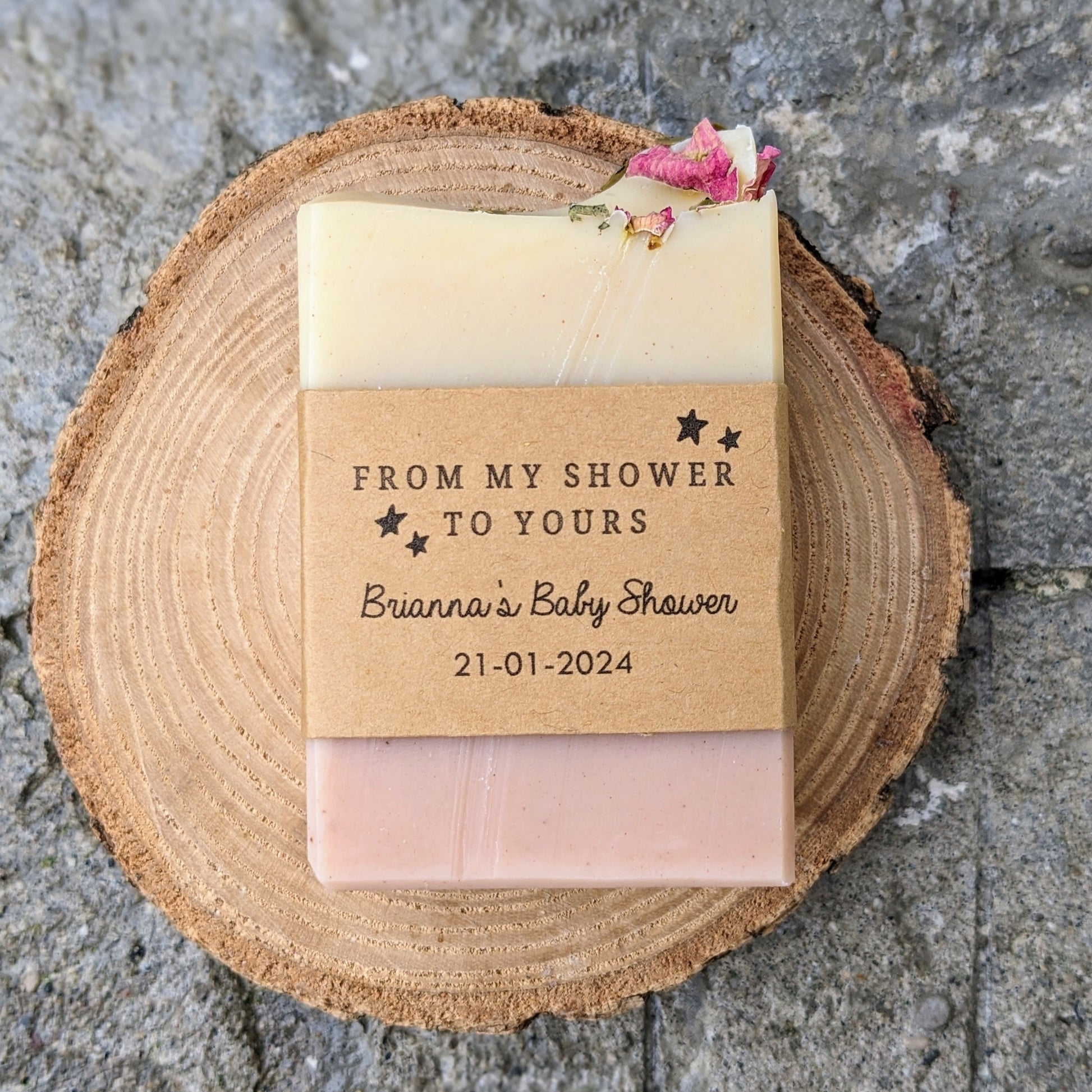 The choice is yours! Labels are printed on kraft brown paper. The ingredients + Botany Barn logo are typically printed on the back. The front label can include whatever text you'd like, as long as it fits! Typically the label will include the type of soap, and may include the date of the event (e.g. "30.06.17"), name of the couple/company (e.g. "Katie + Tom"), or a phrase like "From Sam's Shower To Yours". **Please enter your label info in personalization box**